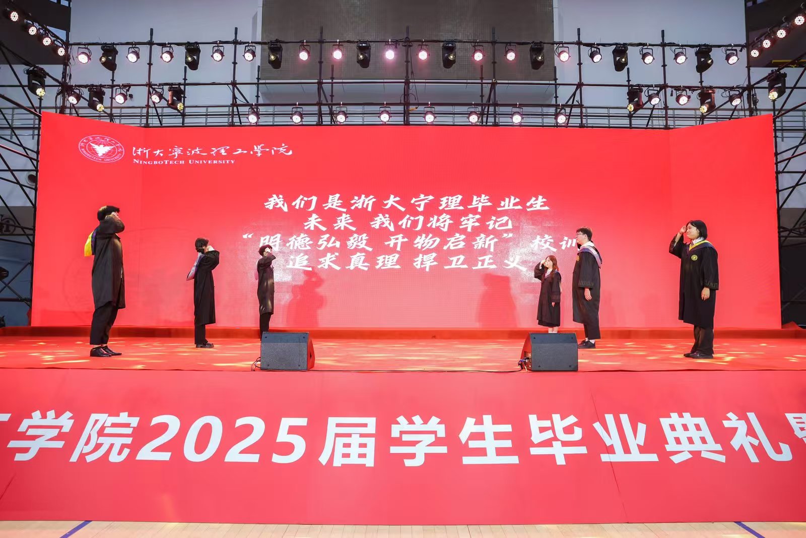 校长杨德仁院士对在场的毕业生致以诚挚的寄语:“做驭变求新的青春答卷人!”四年前,毕业生们在中国共产党成立100周年的喜庆时刻来到浙大宁理,与这所拥有“求是”精神血脉的校园不期而遇,在浙大宁理茁壮成长,成绩斐然。四年后,毕业生们迎来了一个加速变革的时代,将成为“与技术共处、与时代共舞”赛道的探界者。杨德仁校长表示,期待毕业生们:一是要精准识变,从变革浪潮中锚定人生航向;二是要主动求变,于未知深水区勇闯创新蓝海;三是要科学应变,在复杂困局中开辟发展通途。主动学习、持续思考,将“识变”的能力内化为成长的基石;永不言弃,让每一次对舒适区的突破,都成为锻造硬核实力的熔炉;让每一次精准应变的抉择,都成为丈量成长的刻度,不断提升应变能力,让每一回从容破局的智慧,都化作滋养心灵的甘露。祝愿毕业生们:以“识变”之清醒、“求变”之果敢、“应变”之智慧,在历史的卷轴上挥毫泼墨,绘就精彩人生!