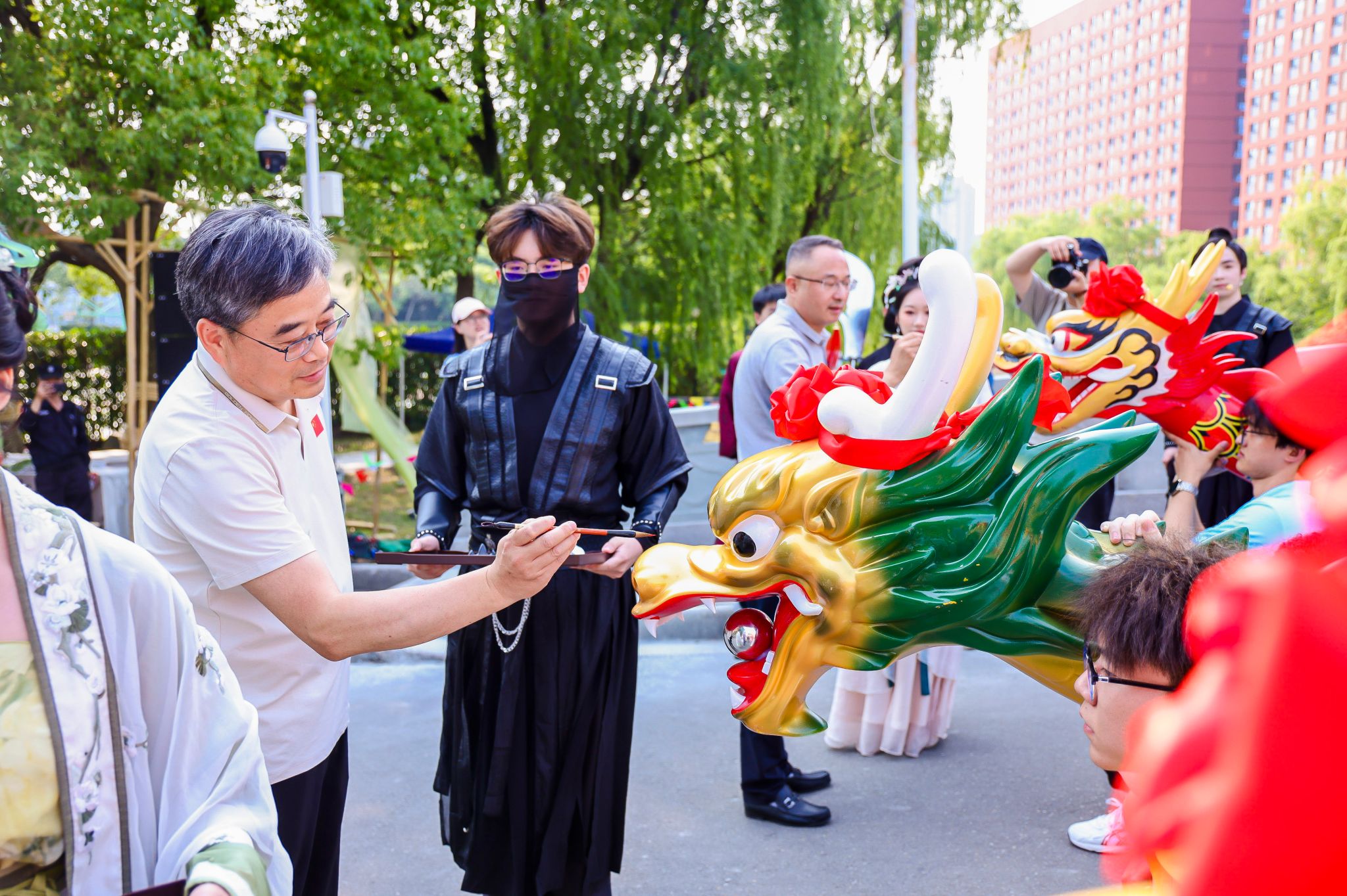 赛前的龙舟开眼仪式,唤醒沉睡的龙舟之魂,让此次龙舟赛事更具传统韵味。学校党委书记徐方、副校长张荣祥,鄞州区委宣传部常务副部长应林辉,鄞州区文联主席、党组书记胡冬平,共同为龙舟“点睛”。