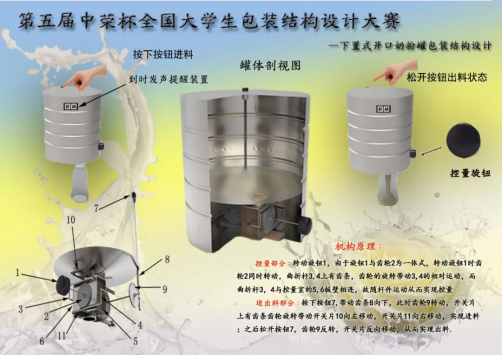 2014获得第五届全国大学生包装结构设计竞赛一等奖(省部级),(名称:倒置式可控量奶粉罐)