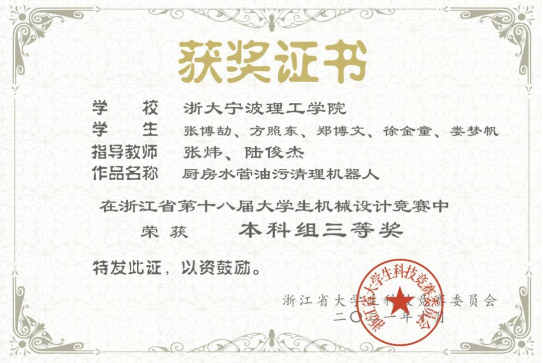 2021获得浙江省第十八届大学生机械设计竞赛三等奖,(名称:厨房水管油污清理机器人)