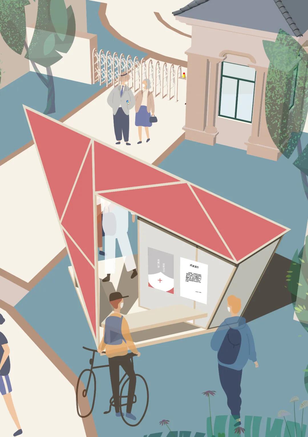 “抗疫大三角”与“传送门”,同学们针对社区内人群聚集、医疗设施不足等实际问题,为社区设计防疫小屋。