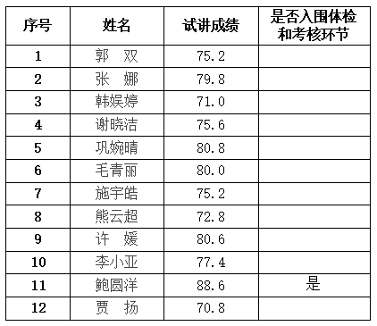 根据《宁波市事业单位公开招聘工作人员实施办法》和《浙江大学宁波理工学院公开招聘事业编制教师的公告》(2019年6月3日)、《浙江大学宁波理工学院公开招聘事业编制教师招聘补充公告》(2019年6月17日),我校2019年公开招聘传媒学院事业编制教师的试讲工作已经结束,现将试讲成绩予以公布。按照本次招考公告规定,根据试讲成绩从高分到低分按招考计划1:1的比例确定体检和考核对象。