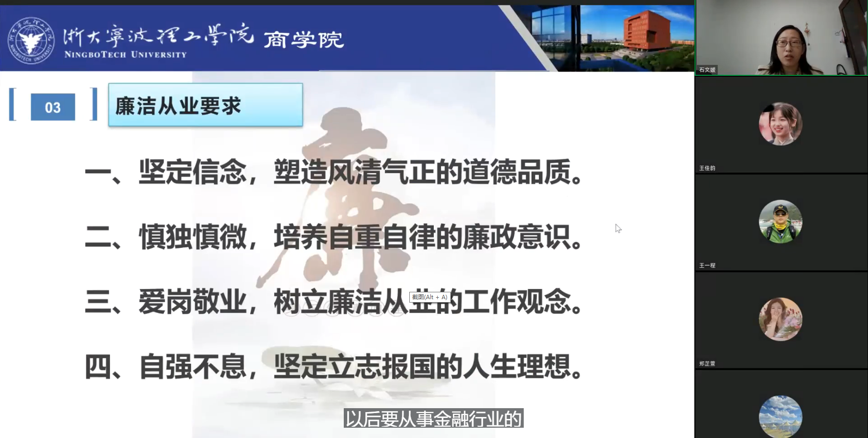 石文媛介绍了浙江省各地就业政策和毕业毕业生就业工作流程,为同学们梳理了毕业生网上签约流程和档案派遣等相关注意事项。学院团委书记潘剑邦老师为大家解读团组织关系转接的相关事宜,重点介绍了转接的流程。学校团委梅呈龙老师同学们为作毕业生征兵入伍相关政策解读。