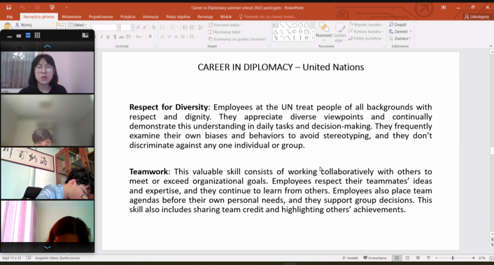 2022年7月15日下午5点,商学院2022年波兰华沙大学暑期线上访学项目圆满结束。浙大宁理学子在短短十天里,通过语言学习、专题讲授、主题讨论、小组汇报等环节,逐渐熟悉了欧洲大学的教学模式。同学们在互动讨论中自信地表达,得到了波兰外教老师们的肯定。中方教师在做好团队管理工作的同时,加强与外方教授的沟通,及时反馈同学们在访学过程中遇到的问题,推进项目顺利进行。