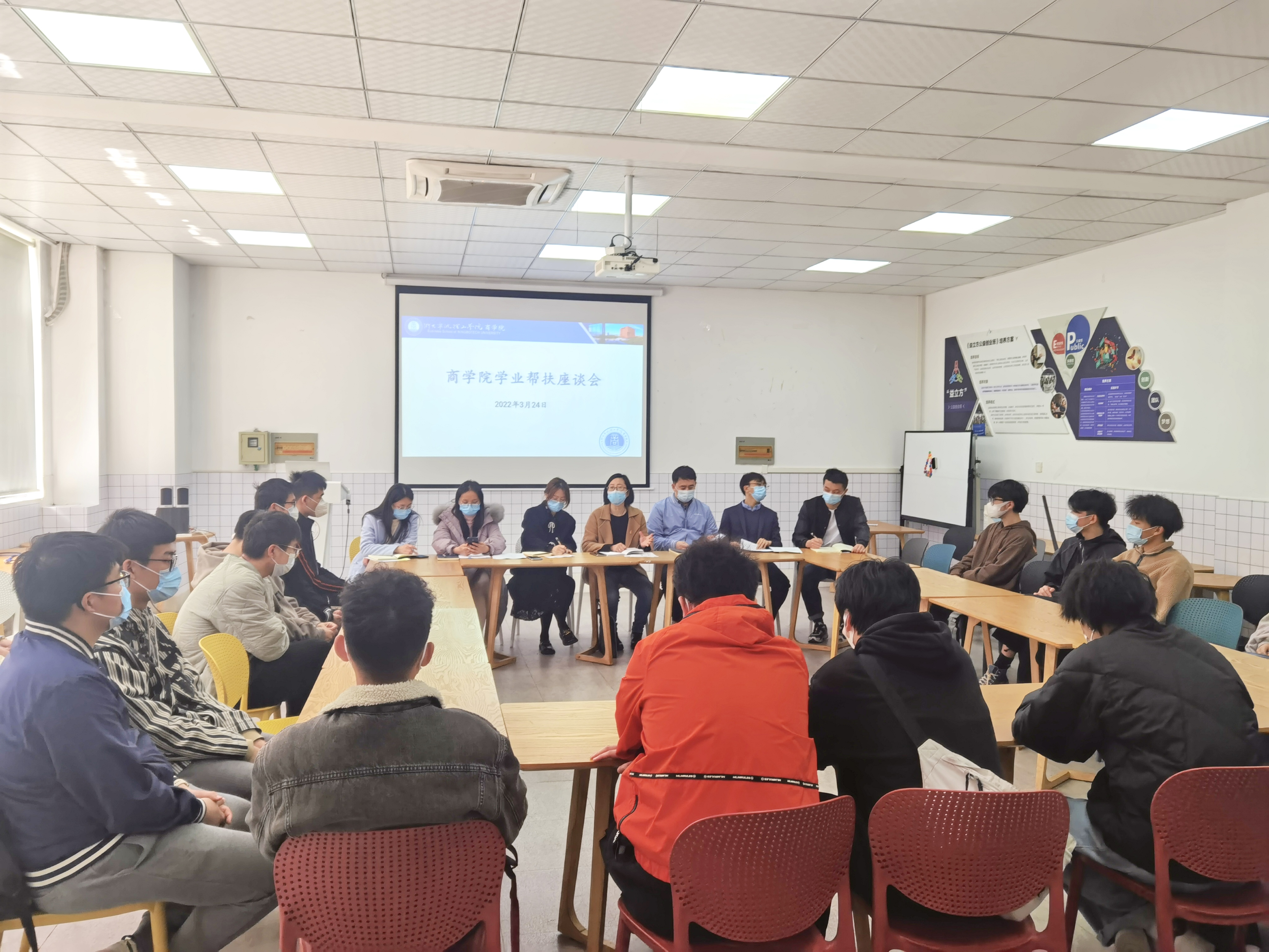 为做好商学院学生学业帮扶工作,2022年3月24日中午,学院在SA206教室举办了学业帮扶座谈会,讲座由学院党委副书记兼纪委书记吴琼主持,商学院学工办辅导员、商学院学生会学风建设部以及需要学业帮扶的同学参会。