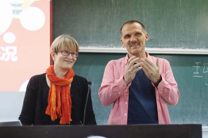 宣讲会上,波兰籍外教Magdalena Gimbut博士和Atur Rega博士向大家介绍了波兰语言、城市、经济、教育等方面的相关咨讯,鼓励大家了解波兰,有机会尝试波兰留学,并和同学亲切交流。