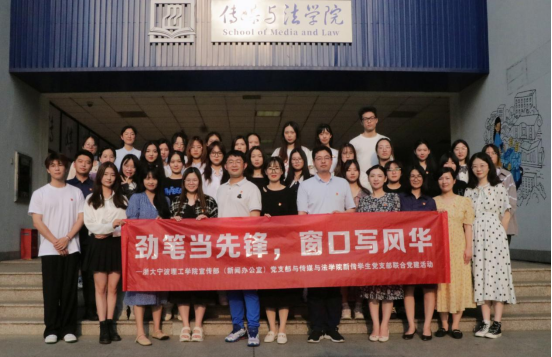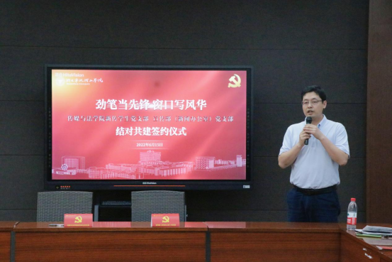 在党的二十大即将召开之际,为交流党支部工作经验、促进学生全面发展,更好发挥基层党支部的建设作用和党员干部、学生党员的先锋模范带头作用。6月15日下午,传媒与法学院新传学生党支部与宣传部(新闻办公室)党支部在SC101举行结对共建签约仪式。宣传部部长、安全保卫部部长、宣传部党支部书记李炜,宣传部副部长韩晶晶,传媒与法学院党委副书记、纪委书记胡鹿鸣,新传学生党支部书记董亚钊以及双方支部的全体党员参加了此次结对仪式。