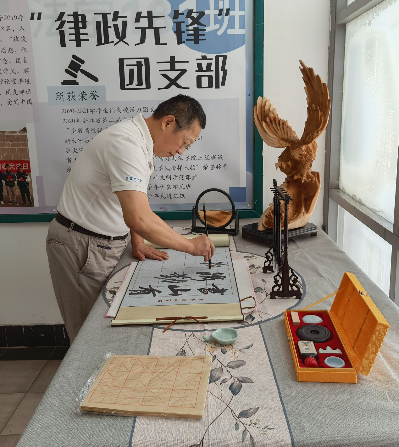 6月6日,传媒与法学院在SC三楼大厅的一处角落设立开放式书法角,供师生静心书写、解压身心。笔墨纸砚置于素雅的桌布上,旁有缓缓流动的流沙画,驻足其中自有一番静谧天地。