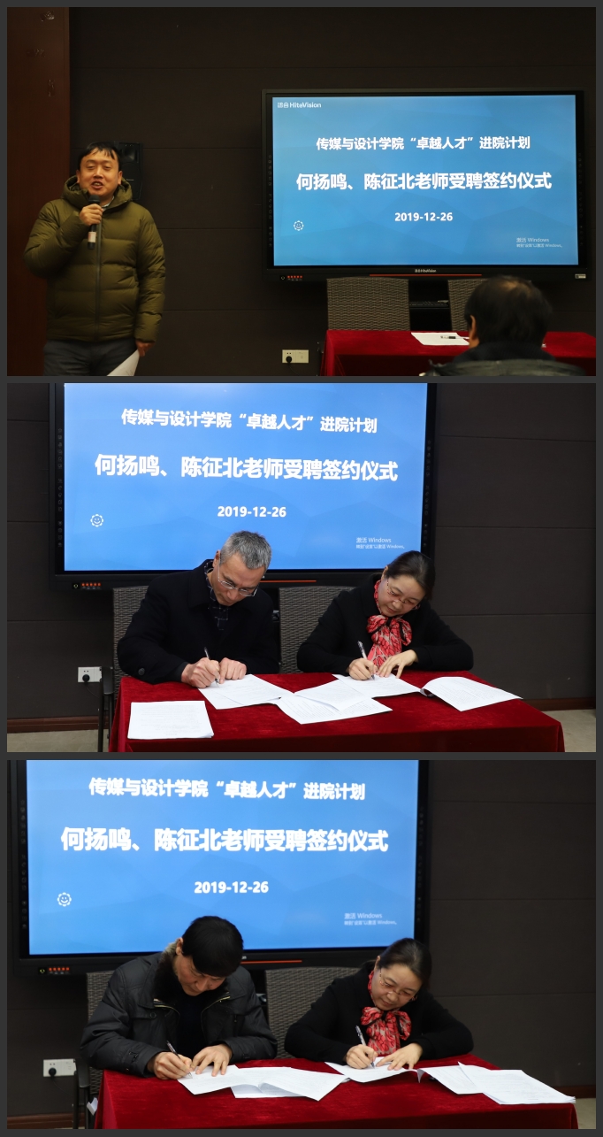 会议第一项内容是何扬鸣与陈征北老师的受聘仪式。王军伟副院长简要介绍了两位老师的教学科研成绩。随后党委书记、副院长朱小红代表学院与两位老师签署约聘任合同。两位老师在学界与业界工作多年,他们丰富的经历和渊博的学识无疑会给学院的专业建设助力,为学院带来活力,促进学科的纵深发展。与此同时,胡鹿鸣还向全院教职工介绍了2019年下半年入职的教师,并对他们的到来表示欢迎。