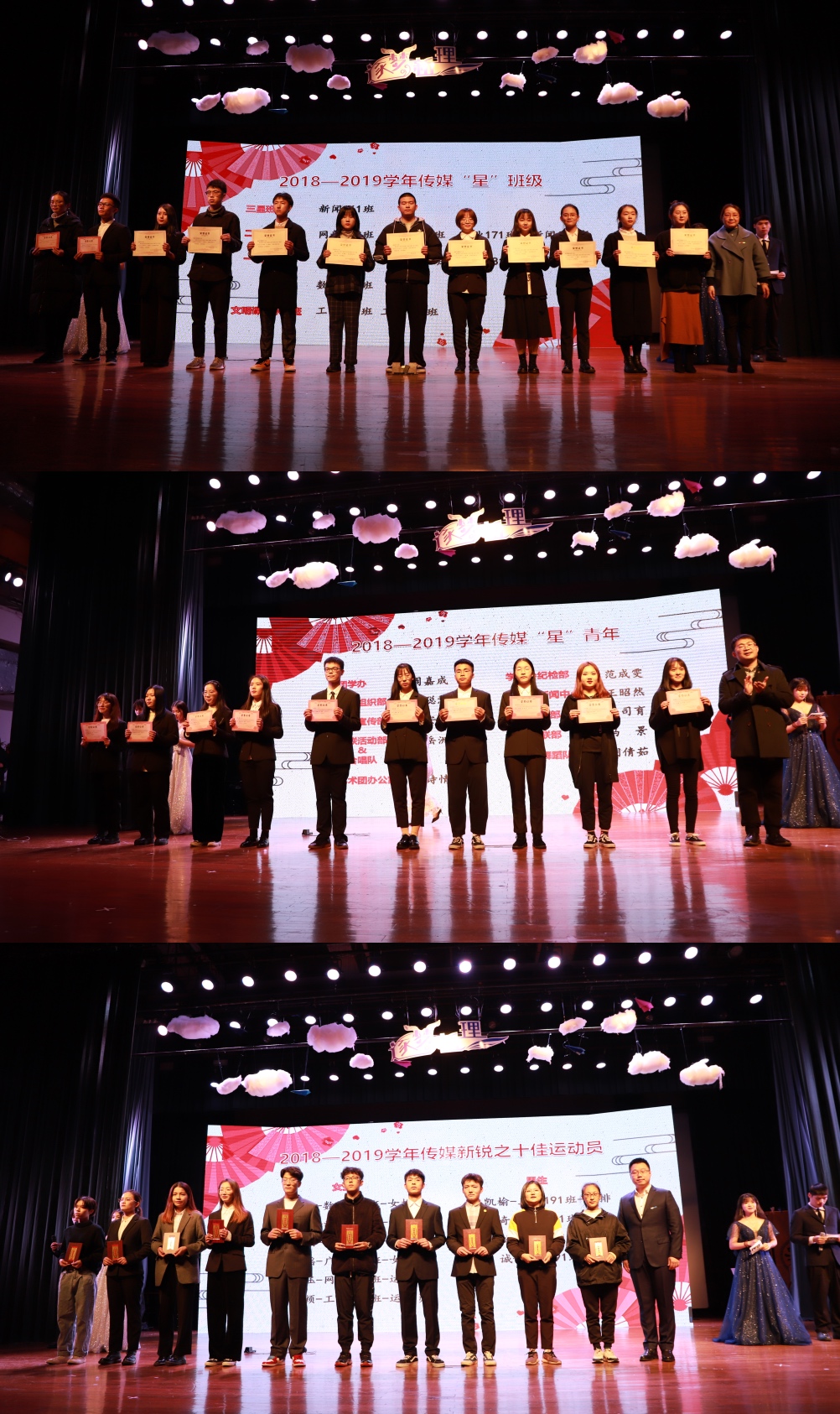 激情昂扬的器乐演奏《鼓楼》拉开了晚会的帷幕。随后,朱小红老师上台致辞,她详尽地总结回顾了学院2019年所取得的成果,表达了对师生们的美好祝愿。在“我们的荣耀”时刻,朱小红老师、胡鹿鸣老师、曲昊杨老师分别为传媒“星”班级、传媒“星”青年和传媒新锐之十佳运动会颁奖。