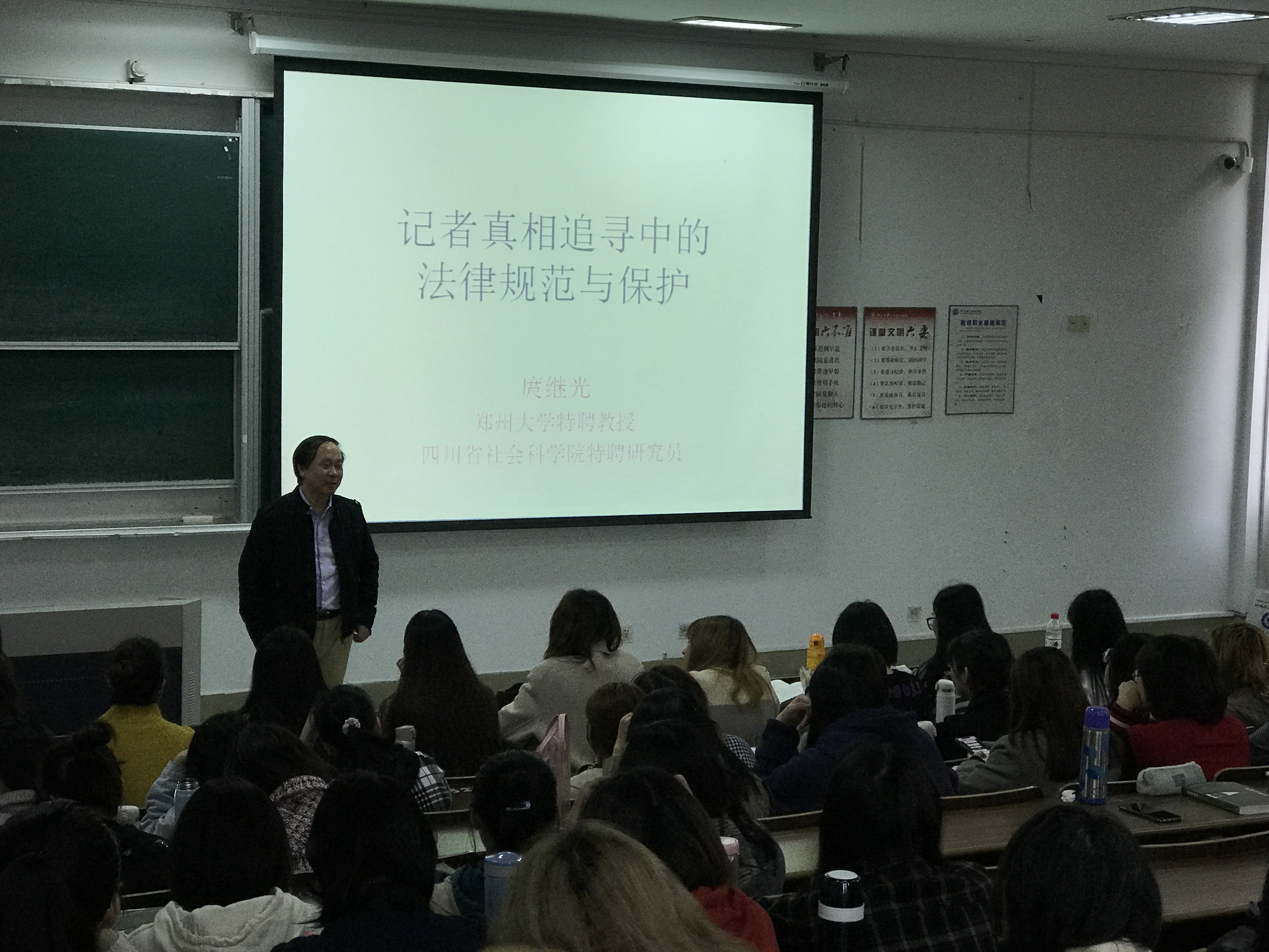 11月22日上午,传媒学院邀请到四川师范大学教授庹继光,来院为学生开展题为《记者真相追寻中的法律规范与保护》的专题讲座。讲座由传媒学院副院长王军伟和新闻所副所长邱子桐博士共同主持,部分新闻学专业学生参加。