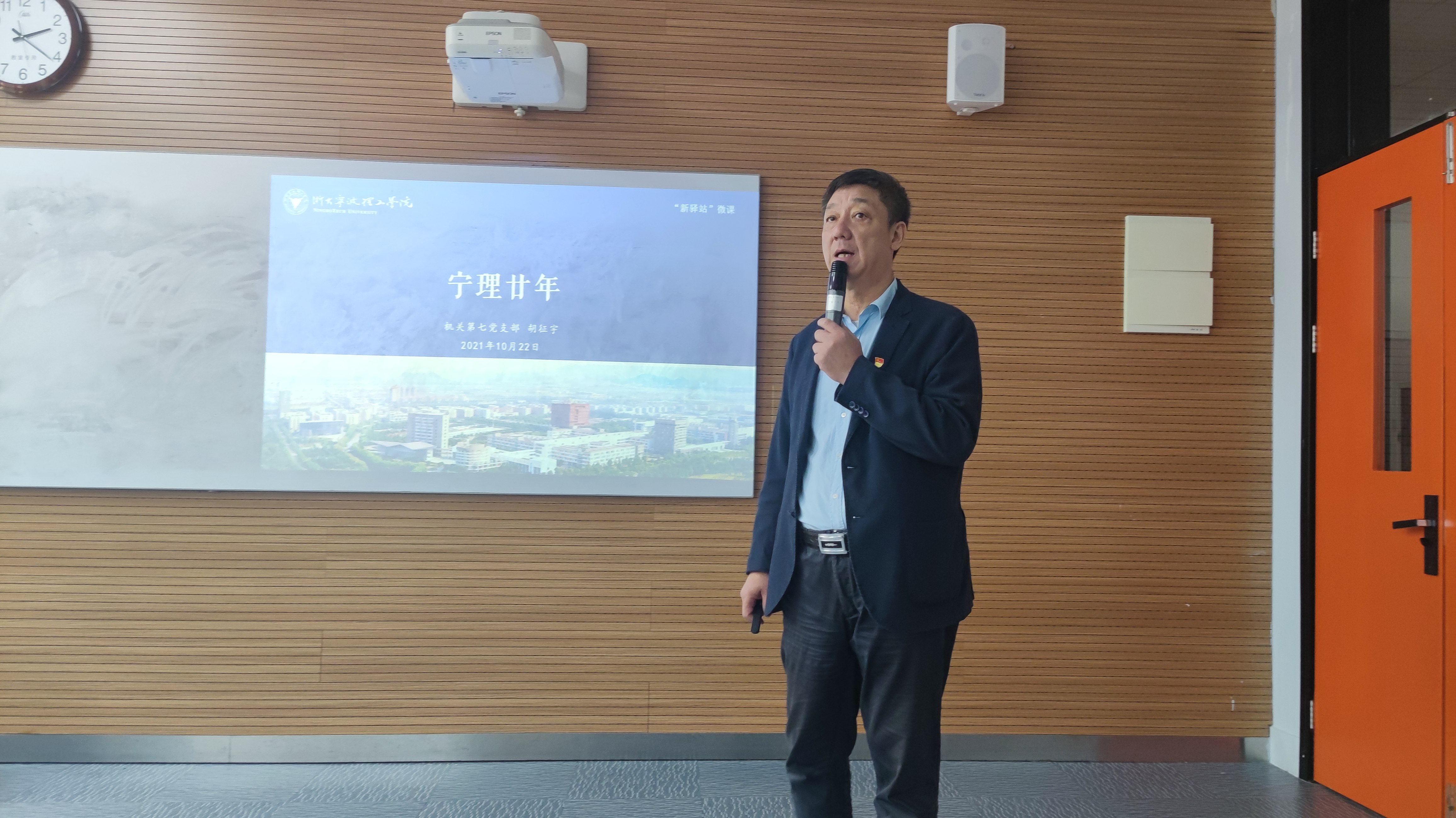 10月22日下午,机关第七党支部“新驿站”微课“宁理廿年”走进数据学院。学校党委书记胡征宇应邀向75位新生代表作微课分享。学院院长庞超逸、党委副书记汪洪及学院辅导员也到场聆听了微课。