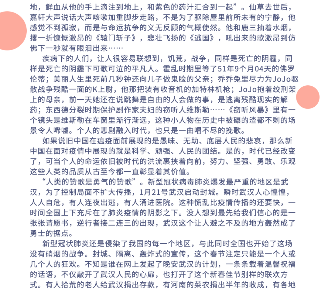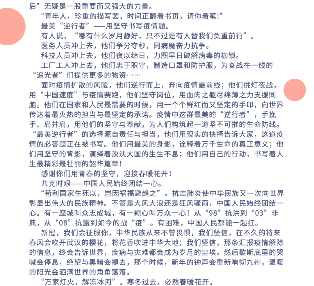 学院也选取了优秀的征文参加了学工部的“共抗疫情,爱国力行”主题征文,共有5名同学的征文进入学工部优秀征文评选。