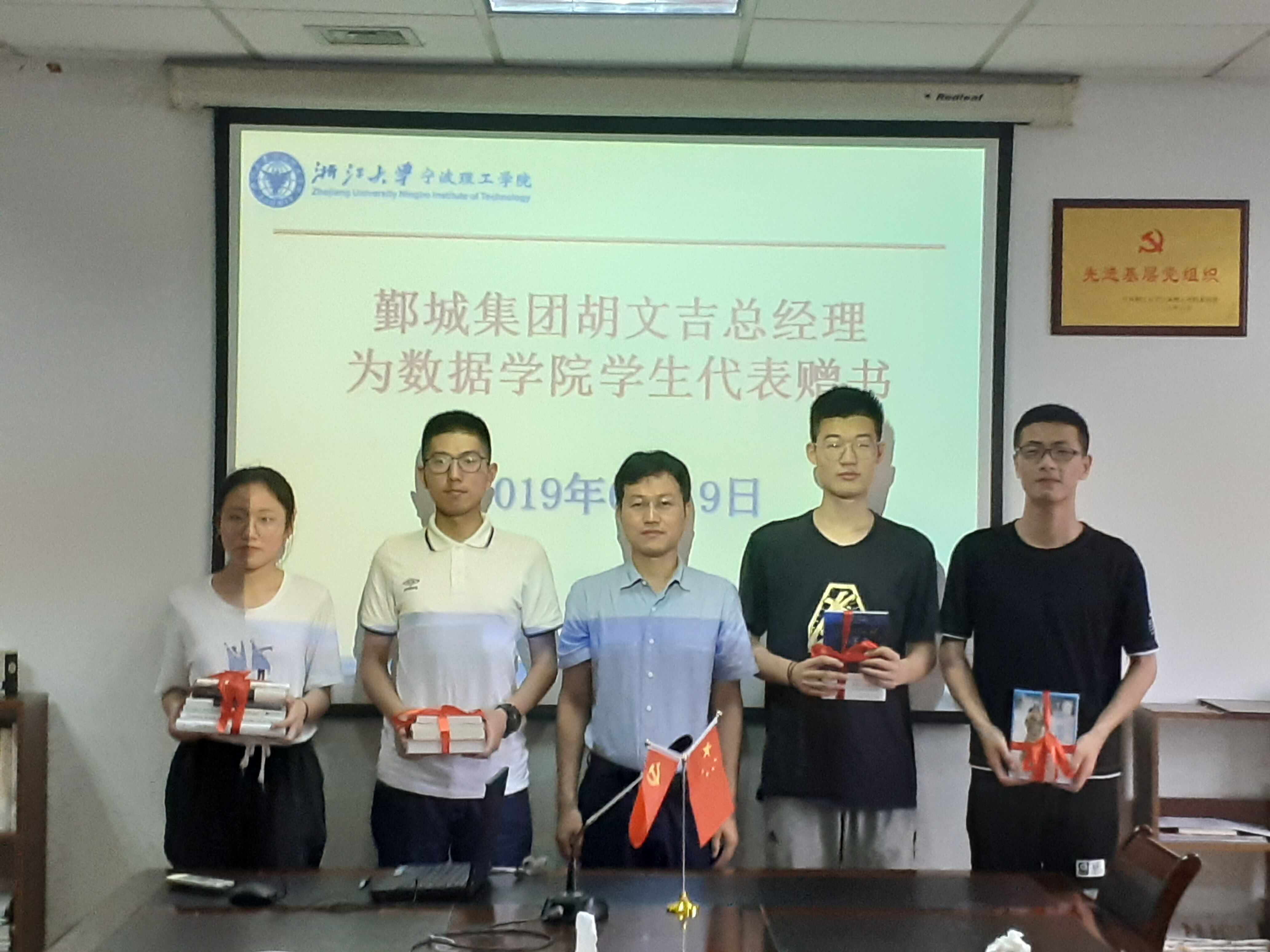 首先,胡文吉总经理为数据学院学生代表举行了图书捐赠仪式,8名“鄞城杯”红色诵读比赛获奖学生参加了仪式。随后,双方就校企党建共建、智慧邻里建设和宁波智慧泊车平台等建设进行了洽谈,并达成了合作意向,后续将签订校企共建合作协议。