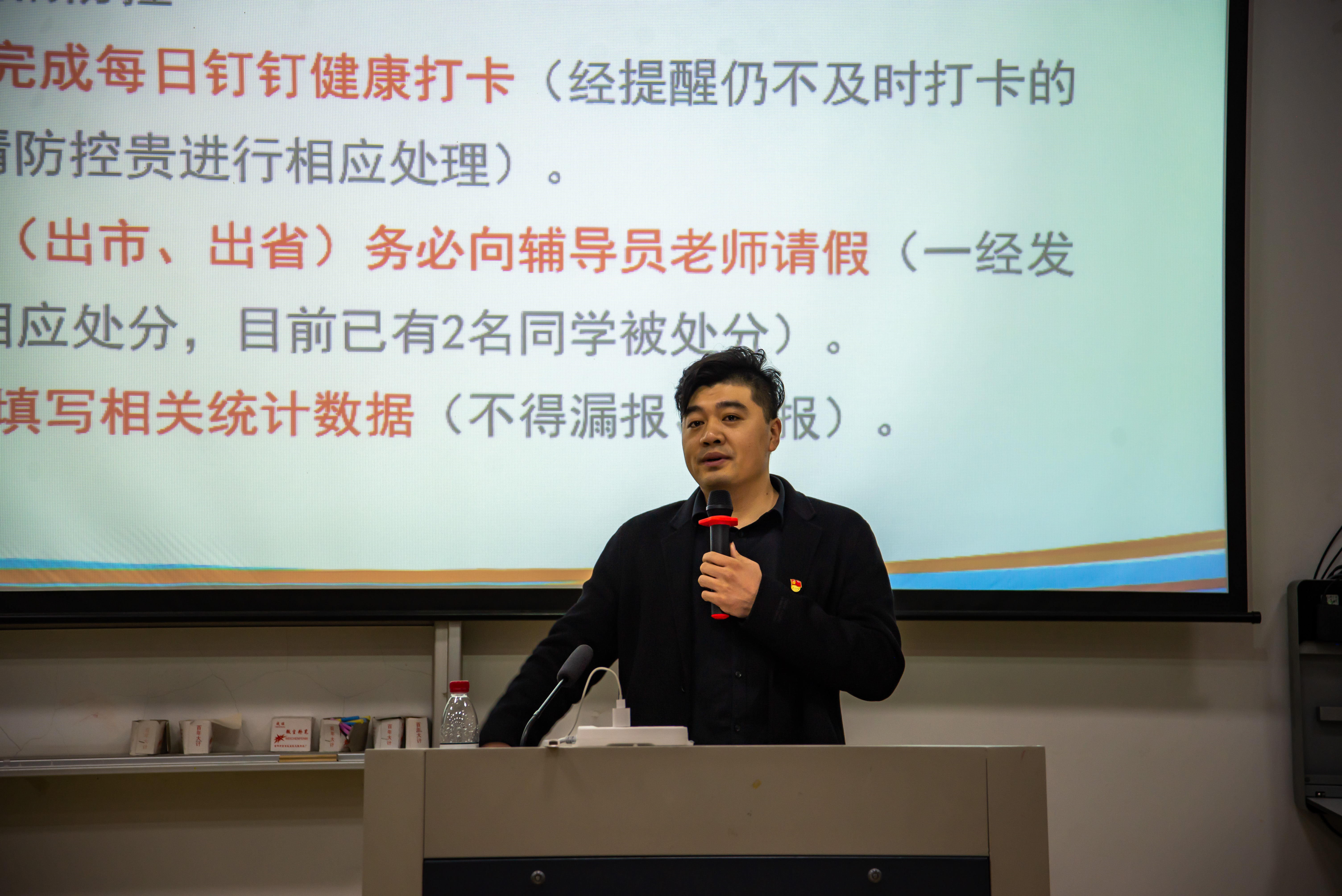 张腾老师提醒大家遵守疫情防控规定,每天按时钉钉打卡,有事出校需要履行请假制度,不隐瞒,不谎报行程。遵守网络行为规范,文明上网,不造谣、不信谣、不传谣。提高警惕,谨防电信诈骗,谨防寝室安全事故,谨防财务丢失。还提出希望同学们关注国家大事,树立远大理想,积极向党组织靠拢。