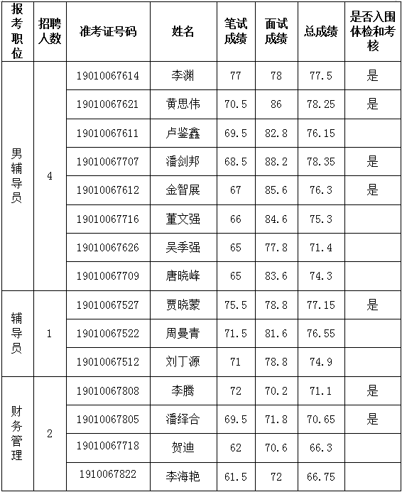 备注:1.总成绩=50%面试成绩+50%笔试成绩;2.资格复审未通过、面试弃考人员无总成绩,不予以公布。